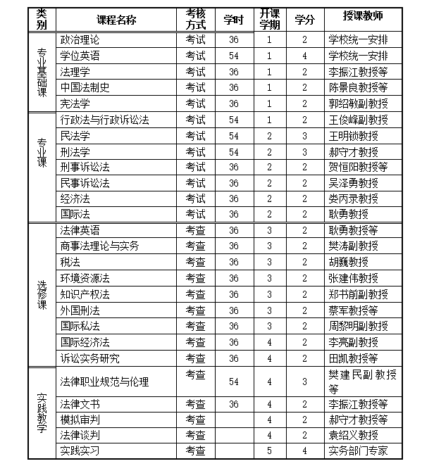 法律硕士(非法学)(035101) Juris Master(non-law) 一、学科简介 法律硕士(非法学)是在借鉴美国、欧洲等国家培养高层次应用型法律专门人才的基础上,结合我国的国情和教育实际而建立起来的具有特定法律职业背景的专业学位,其旨在培养包括法官、检察官、律师以及法律服务、法律监督和经济管理、社会管理等方面的法律应用型人才。我校2004年获批法律硕士专业学位授权点并于2005年开始正式招生,现已培养法律硕士专业学位研究生近千人。 二、研究方向 根据毕业论文选题,可以选择法学专业二级学科各研究方向。 三、培养目标及基本要求 为法律职业部门培养具有社会主义法治理念、德才兼备、高层次的复合型、实务型法律人才。具体要求为: (一)掌握马克思主义的基本原理,自觉遵守宪法和法律,具有良好的政治素质和公民素质,深刻把握社会主义法治理念和法律职业伦理原则,恪守法律职业道德规范。 (二)掌握法学基本原理,具备从事法律职业所要求的法律知识、法律术语、思维习惯、法律方法和职业技术的能力。 (三)能够综合运用法律和其他专业知识,具有独立从事法律职业实务工作的能力,达到有关部门相应的任职要求。 (四)较为熟练地掌握一门外语,能阅读专业外语资料。 四、招生对象 具有国民教育序列大学本科学历(或具有本科同等学力)的非法学专业毕业生。 五、学习形式与年限 法律硕士(非法学)全日制学制为三年。 六、课程设置