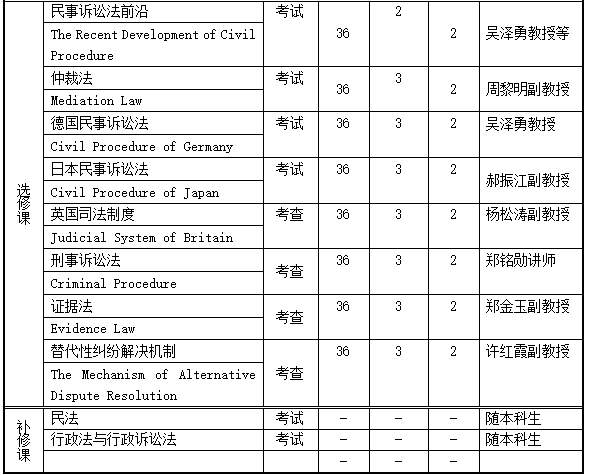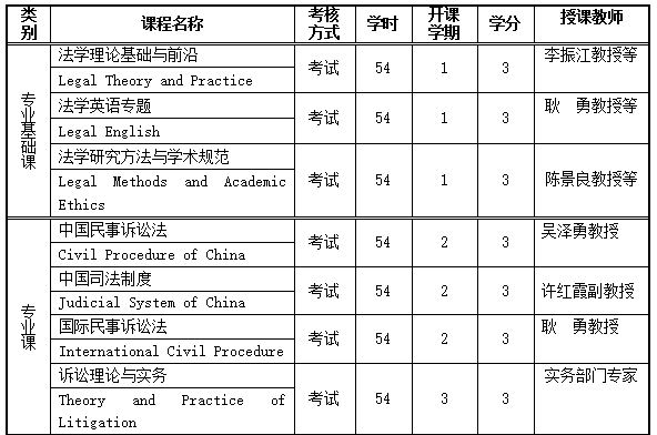 诉讼法学(030106) Procedural Law 一、学科简介 诉讼法学是法学最主要的分支学科之一,主要以民事诉讼、刑事诉讼、行政诉讼这三大诉讼法以及相关的纠纷解决方式为其研究对象。按照实体法与程序法的划分,诉讼法学的研究对象就是所谓的程序法。程序在西方法治的形成和确立过程中居于重要的位置,相应地,关于诉讼法的研究在西方国家也非常发达。在我国,由于由来已久的“重实体,轻程序”的传统,程序法制极其落后,诉讼法学也长期得不到发展。改革开放之后,我国走上了建立社会主义民主与法治的道路。在此过程中,人们越来越认识到:没有程序就没有法治;而建设程序法,首先就要加强诉讼法学的研究。为此,近二十年来,诉讼法学研究在我国蓬勃发展,至今仍呈方兴未艾之势。我校诉讼法学科为省级重点学科,在河南省内乃至全国诉讼法学部分研究领域居于领先地位。 二、研究方向 1.中国民事诉讼法 2.中国司法制度 3.国际民事诉讼法 三、培养目标及基本要求 培养具有马克思列宁主义的世界观和方法论,德、智、体、能、美全面发展的社会主义法治建设的高层次专门职业人才,并具有博学笃行,厚德重法,坚持正义,维护法制所特有的政治品格。业务上应清楚地了解本学科的研究范围与前沿,明确理论与实践方面的热点和难点;牢固掌握并运用诉讼法学的基本理论,系统深入地掌握本专业知识;熟悉我国有关诉讼法的立法与司法体系;熟练地掌握一门外国语,能阅读本专业的外文资料;掌握解释适用法律的方法,具有独立分析和处理诉讼案件及相关案件的能力;能独立熟练地运用材料信息和现代研究手段,承担诉讼法理论研究、教学、立法、司法和法律实务工作。 四、招生对象 具有国民教育系列大学本科/专科学历(或本科同等学力)人员。 五、学习形式与年限 全日制学习年限一般为三年。第一学年主要学习学位公修课和基础理论课程;第二学年主要学习学位专业课程,进行教学实习和学位论文开题报告;第三学年主要进行硕士论文的写作和答辩。 六、课程设置