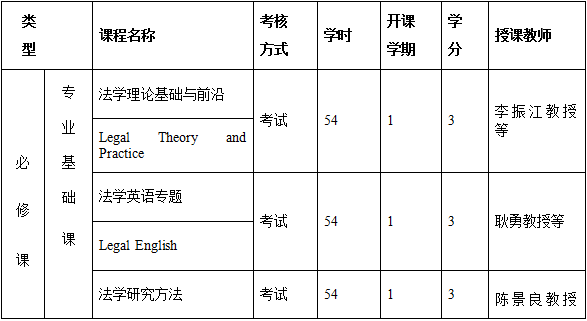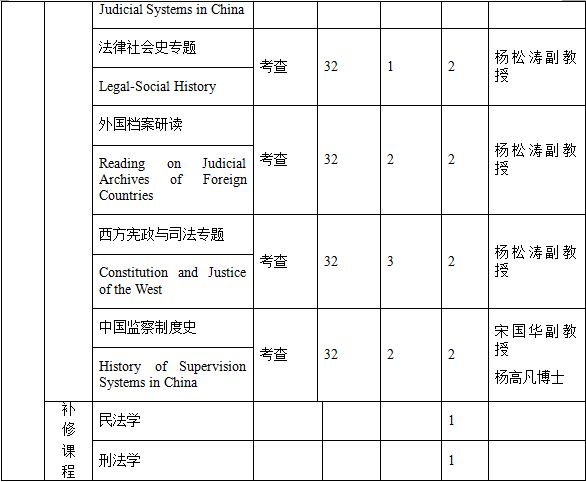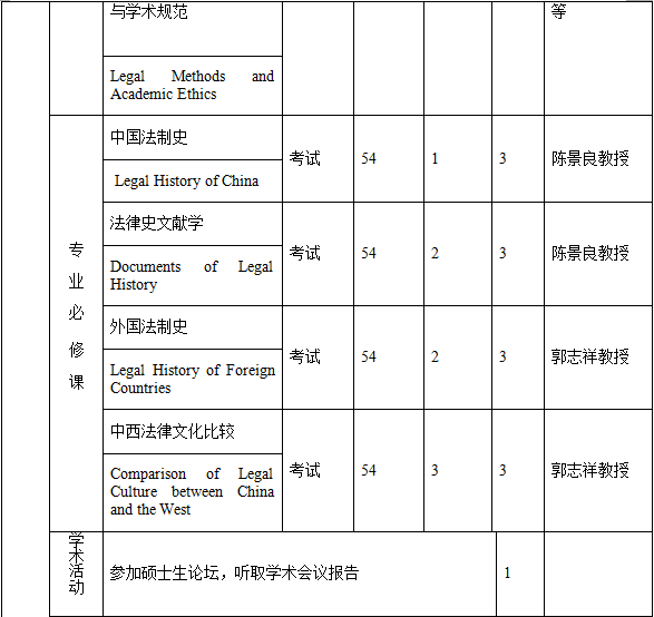 法律史(030102) Legal History 一、专业简介 本专业法律史为法学基础学科之一,重在通过研究历史上法律的演变过程,探讨法律与社会发展的互动关系,以提出更为扎实的法学理论,丰富和完善人们的法学认知。 本硕士点的师资力量较为雄厚,侧重于探讨中国司法传统,所涉历史时期跨越唐宋至民国,通过探讨此时期中国司法的制度演进及实际运作,以为学界更为准确地认识传统中国法律提供学术资源。 二、培养目标 本专业的培养目标是将研究生培养成具备本专业基本素养,能够胜任科研、教学及实务部门工作的高素质复合型专门人才。 1. 掌握比较宽广的法学基础理论和系统的法律史学知识; 2.深入了解中外法律文化的优良传统,具有较好的理论分析能力和解决实际问题的能力; 3.具有较强的古代汉语文献阅读能力,能熟练地掌握和运用至少一门外国语。 三、修业年限 研究生学习年限为一般三年。如提前完成培养计划,学位论文符合申请答辩要求的研究生,经过规定的审批程序可以提前答辩。 四、研究方向 1.中国法律史 (Legal History of China) 2.外国法律史(Legal History of Foreign Countries) 3. 中国古代法律文献学( Legal Documents of Ancient China) 五、课程设置