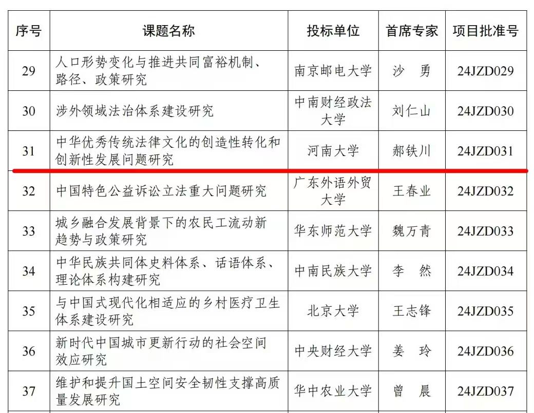 1月24日,教育部社会科学司公布“2024年度教育部哲学社会科学研究重大课题攻关项目”立项名单。我校郝铁川教授主持申报的“中华优秀传统法律文化的创造性转化和创新性发展问题研究”课题获批立项,该项目系2021年以来河南省唯一立项,也是我校继2014年以来再次获批该项目。