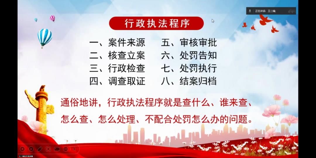 王二锋调研员从行政执法基本知识、行政执法程序要求、行政执法基本原则三个方面对“什么是行政执法”“如何开展行政执法”“行政执法的基本遵循”等问题进行深入阐释。王二锋调研员强调,在行政执法中,应当根据群众的实际情况,对症下药,解决问题,牢牢把握住公平正义这个价值需求,让每位人民群众在每一个执法决定中都能切实感受公平正义。整场讲座图文并茂、案例丰富、内容详实,全面梳理与重点解读相得益彰,既彰显了法律人的严谨法治思维,又灌注着公职人员的浓郁人文关怀。最后,王二锋调研员的授课在热烈的掌声中结束。
