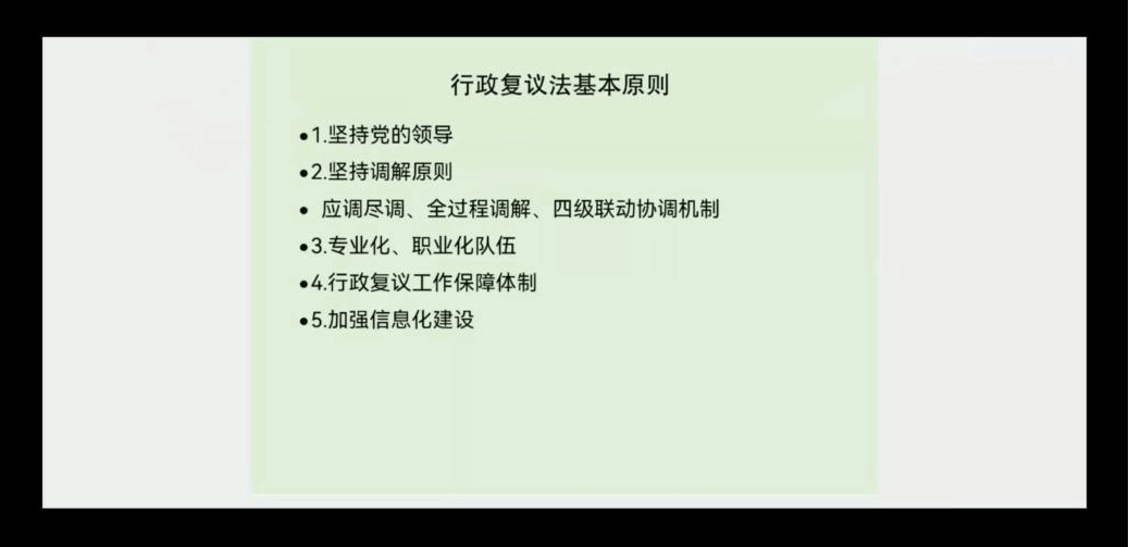 刘杰调研员以《中华人民共和国行政复议法》修改为背景,对行政复议法修订的整体进路和修订亮点进行扼要介绍,深入分析了行政复议化解行政争议的主渠道作用。进而,刘杰调研员从行政复议的范围、申请和审理三个方面对我国行政复议的制度进行深入解读,并以河南省的典型案例为切入口,介绍了河南行政复议审核的聚焦点;最后,刘杰调研员强调,行政复议工作必须做到让人民群众在每一个行政复议案件中感受到公平正义。整场授课案例详实、内容丰富,具有很强的指导性和实践性,既彰显了法律人的严谨法治思维,又灌注着公职人员的浓郁人文关怀。