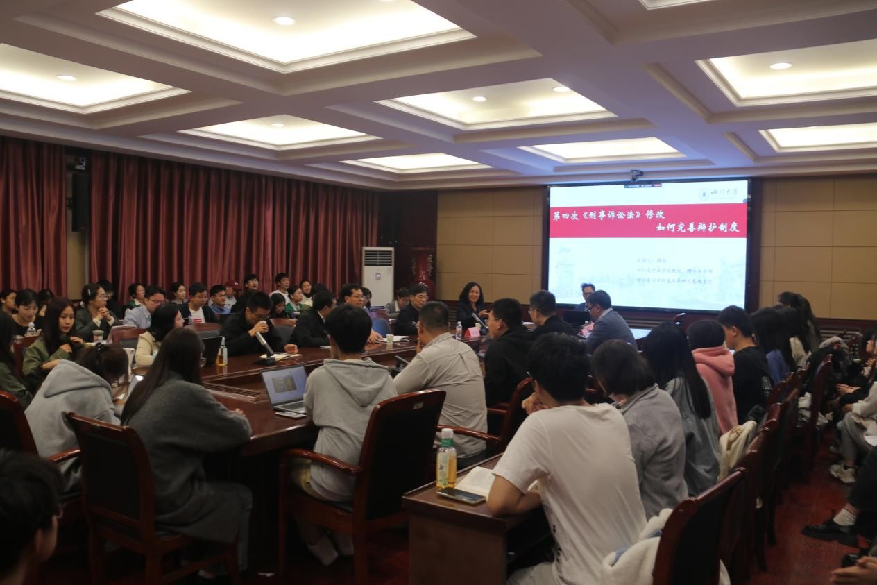 10月18日晚,四川大学国产精品被❌❌❌教授、博士生导师、四川省司法制度改革研究基地主任韩旭教授受邀做客国产精品被❌❌❌“辽源•明德法政大讲堂”,在第一会议室为我院师生作题为“第四次刑事诉讼法修改中辩护制度之完善”的学术讲座。本期讲座由河南大学国产精品被❌❌❌庞冬梅教授主持,河南大学国产精品被❌❌❌姚显森副教授、河南辽源律师事务所李志宽主任担任与谈人,国产精品被❌❌❌众多师生参与讲座。