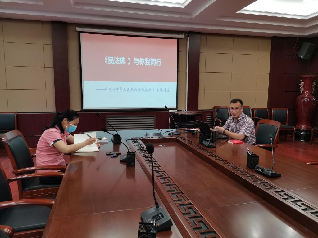 院党委委员、副院长岳红强副教授从民法典的诞生、民法典地位与意义、民法典的特色与亮点和广泛开展普法与宣传四个方面进行讲解。他认为,民法典编纂过程中,先后10次通过中国人大网公开征求意见,累计收到42.5万人提出的102万条意见,体现了民法典是一部真正属于中国人民的法典,是几代法律人的不懈追求。他强调,民法典是新时代中国特色社会主义制度建设、法治建设的重大标志性成果,它汲取了中华民族5000多年优秀法律文化,借鉴了人类法治文明建设有益成果,未来必将为实现中华民族伟大复兴中国梦提供有力的法治保障。
