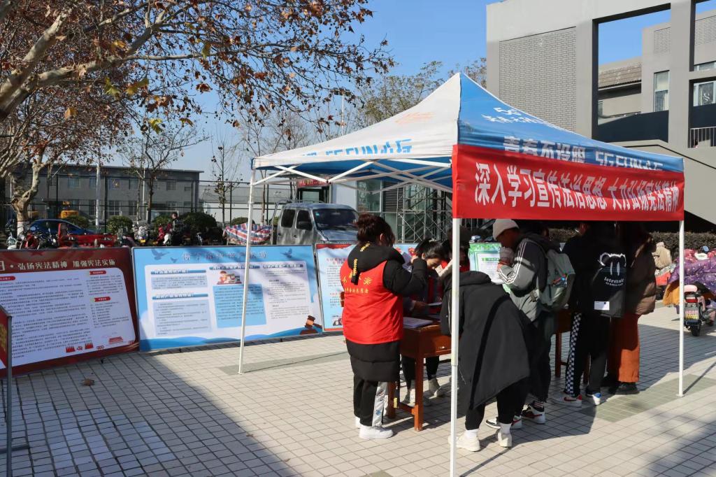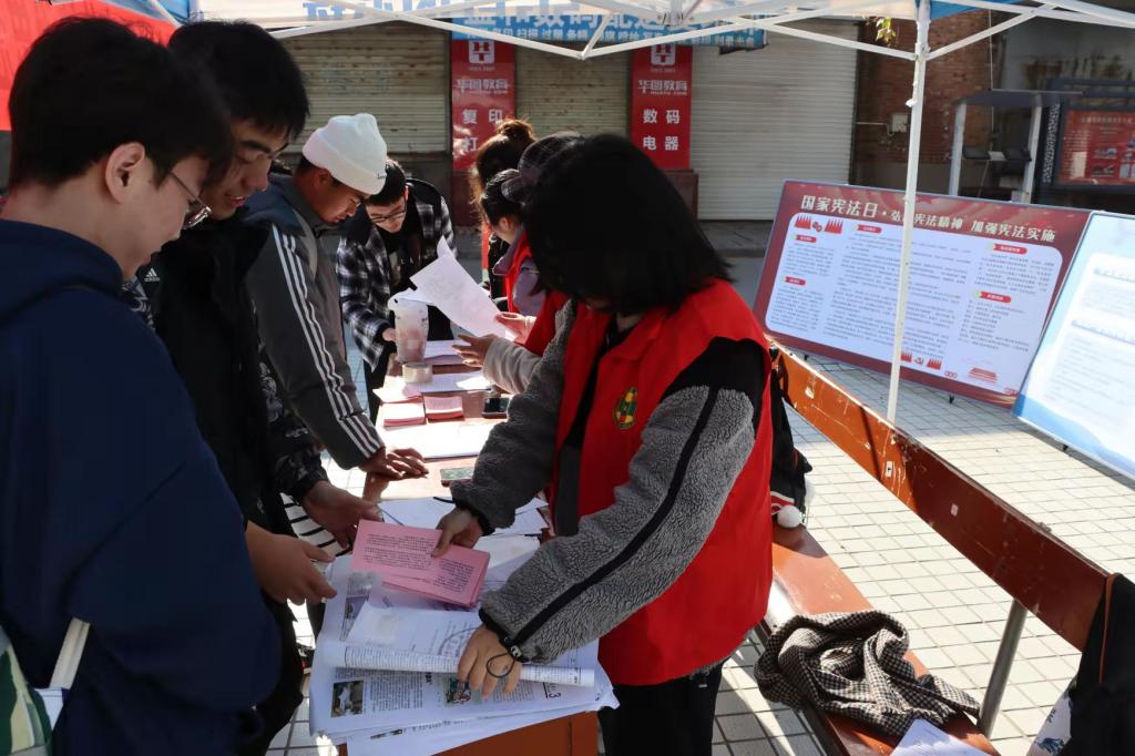 随后,志愿者们还在中心食堂前设置了宪法宣传摊位,进行普法宣传。活动通过限时背诵法条、运用法律知识分析案例、法律常识问答等游戏方式,向参与同学潜移默化地普及宪法。现场还设计了“我手写我心”、“我和宪法合个影”等互动环节,鼓励同学们以笔书写宪法意,以心感悟宪法情,手持主题拍照道具宣传宪法。向全校师生深入宣传宪法知识和宪法精神,营造了良好的学习宪法、尊崇宪法、维护宪法和运用宪法的校园法治文化氛围。
