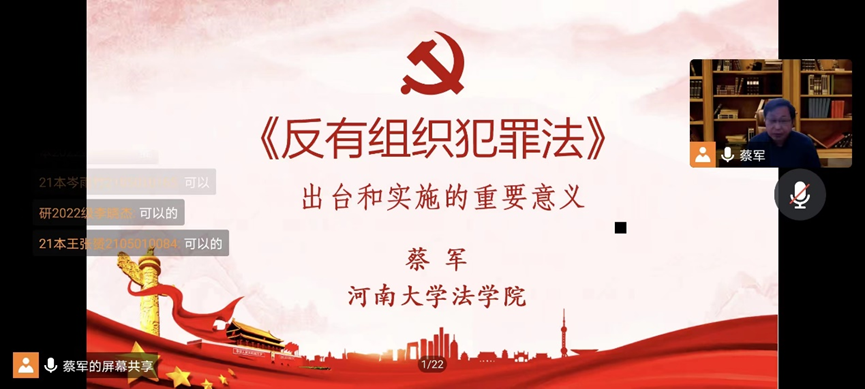 国产精品被❌❌❌院长、党委副书记蔡军以“制定《反有组织犯罪法》出台和实施的重要意义”为主题,从法治意义、社会意义与政治意义三方面为同学们详细讲解了《反有组织犯罪法》。会上,蔡军院长提出《反有组织犯罪法》贯彻落实了党中央扫黑除恶的决策部署,维护了国家政治安全,提升了国家治理体系和治理能力的现代化水平。同时,它提升了反有组织犯罪工作的法治化、规范化、专业化水平,保障了在法治轨道上常态化、机制化开展扫黑除恶工作。最后蔡军院长提出《反有组织犯罪法》具有推进社会治理的现代化与法治化,确保人民安居乐业、社会安定有序、国家长治久安的重要作用,加深了同学们对《反有组织犯罪法》的理解。