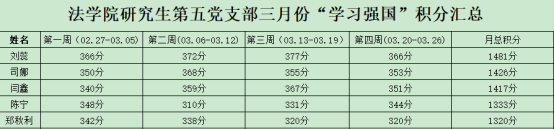 研究生第五党支部“学习强国”周积分于2023年2月27日实行,主要目的是通过对学习积分的总结与汇报,使支部党员之间形成你追我赶的学习氛围,激发党员自觉加强政治理论学习的主动性和积极性。截至目前已实行五周时间,总体学习情况良好,支部同志们积极自律主动学习,每天学习保质保量的完成,已营造出浓厚的主动学习氛围。
