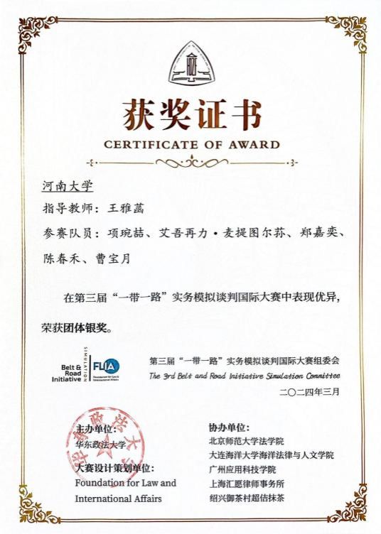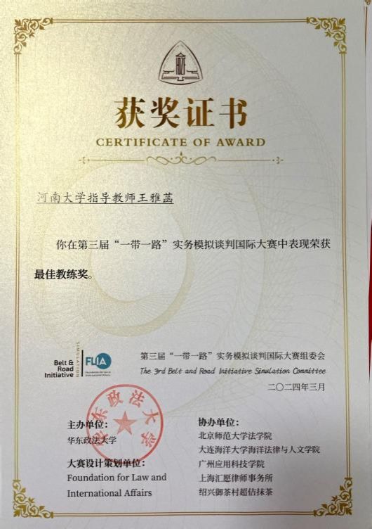 此外,王雅菡老师还承担国际私法课程的双语授课任务,探索在国际法学科体系下培养具备“外语+法学”综合能力,具备国际规则意识、国际化视野、德法兼修的卓越涉外法治人才。为进一步提升学生的综合能力和实践能力,王雅菡老师指导涉外班和卓越班学生参加了由华东政法大学主办,北京师范大学、大连海洋大学等协办的第三届“一带一路”实务模拟谈判国际大赛(全英比赛),河南大学国产精品被❌❌❌参赛学生在76支高校队伍中脱颖而出,取得全国第七的佳绩。河南大学国产精品被❌❌❌代表队获得高校代表队团体银奖、外交风采奖、公共演说奖、最佳教练奖共4项奖项。