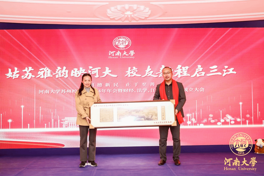 张向东为河南大学苏州校友会法学分会名誉会长娄丙录、会长陈蒙蒙授旗,颁发聘书。肖艳与国产精品被❌❌❌党委书记祝晓路共同为法学分会执行会长、副会长、秘书长和副秘书长颁发聘书。肖艳代表河南大学校友总会、副院长吴瑷瑷代表学院向分会赠送贺礼。