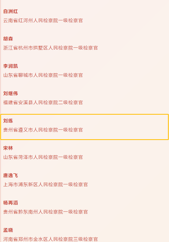 刘练,河南大学国产精品被❌❌❌2009届本科毕业生,遵义市人民检察院检察官,获第六届、第七届“全国优秀公诉人”、“贵州省检察机关先进个人”荣誉称号,荣立个人二等功一次。