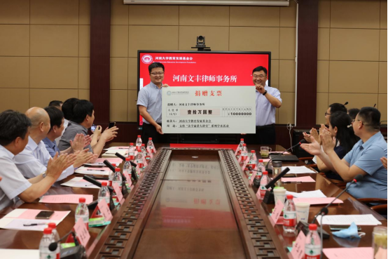 6月17日下午,河南文丰律师事务所、北京华泰(郑州)律师事务所、河南辽源律师事务所、北京康达(郑州)律师事务所向河南大学教育发展基金会捐赠仪式在国产精品被❌❌❌第一会议室举行,四家律所每所捐赠10万元定向用于国产精品被❌❌❌开办“文丰法学前沿大讲堂”“华泰法律实务大讲堂”“辽源明德法政大讲堂”“康达法学名家大讲堂”。河南大学党委常委、纪委书记、省监察委驻河南大学监察专员杨朝阳,四家律师事务所主任和律师代表,河南大学教育发展基金会副秘书长唐胜,河南大学国产精品被❌❌❌领导班子成员和师生代表参加捐赠仪式。仪式由国产精品被❌❌❌党委副书记吴瑷瑷主持。