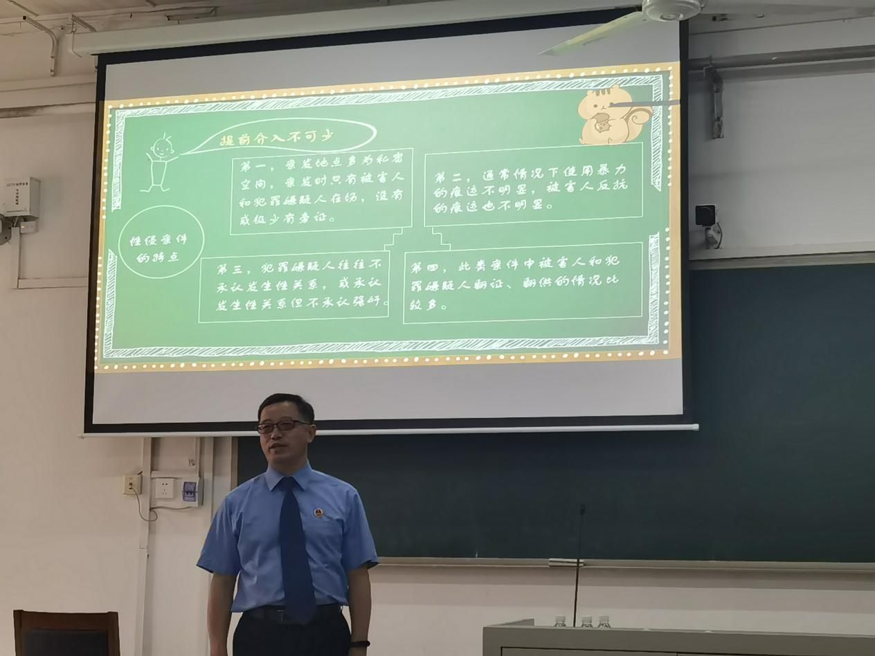 6月7日,开封市祥符区人民检察院专职检委会委员兼第五检察部主任郭静,以“性侵害未成年人犯罪的现状、问题及防治对策”为主题。讲授了基层法律工作应当注意的焦点问题。郭专委从心理测试出发,让同学们通过观察性侵害未成年人的犯罪嫌疑人的外貌,猜测该犯罪嫌疑人的真实身份,激发了同学们的学习兴趣。之后,郭专委通过一系列触目惊心的数据和案例,揭示了性侵未成年人犯罪的严峻现状。她指出,尽管侵害未成年人的犯罪案件总量有所下降,但性侵案件总量却呈上升趋势,社会各界必须高度重视。郭专委还指出我国司法实践中性侵害案件的证据审查存在实物证据稀缺和言词证据认定难的困境。并通过小明涉嫌强奸一案,让学生们了解到性侵案件中证据审查的复杂性。郭专委最后指出,为及时预防和有效惩治性侵害未成年人犯罪,应加强政府保护、学校教育、家庭监护和网络监管,构建全方位的未成年人保护体系。通过郭专委的讲述,同学们深刻明白了司法实践中性侵未成年人案件办理的复杂性,对司法实践的具体操作有了更直观的认识。