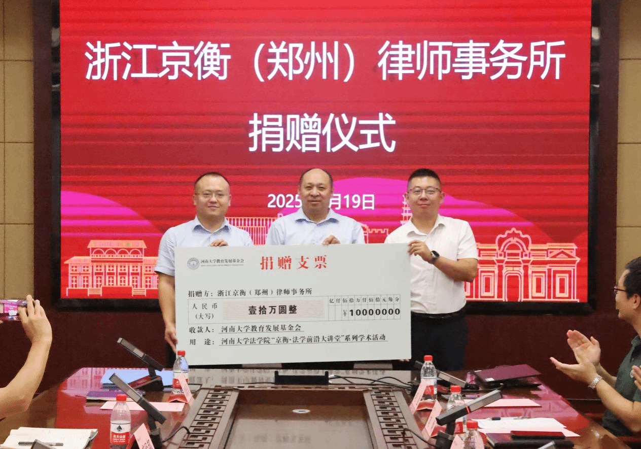 祝晓路书记表示,此次签约和捐赠不仅体现了浙江京衡(郑州)律师事务所对法学教育事业的高度重视,更彰显了法律人“知行合一、回馈社会”的责任担当。这笔捐赠将专项用于“法学前沿大讲堂”学术交流活动,助力我院培养更多具有家国情怀、专业素养和实践能力的卓越法治人才,在服务法治中国、法治河南建设中展现更大作为。