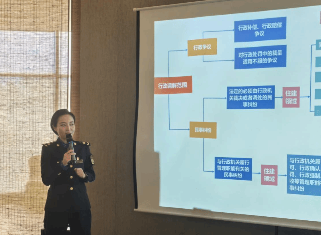 韩苗苗以《市政公用执法领域常见纠纷的行政调解》为题进行发言。明确市政与公用事业执法范畴,指出损坏相关设施引发的侵权责任纠纷是该领域常见矛盾,结合热力设施赔偿实例来界定行政调解包含行政争议与民事纠纷两类,解释以调解代处罚、超范围调解等常见问题,并通过历史文化街区相关案例凸显调解的重要价值,为经济社会高质量发展贡献法治力量。