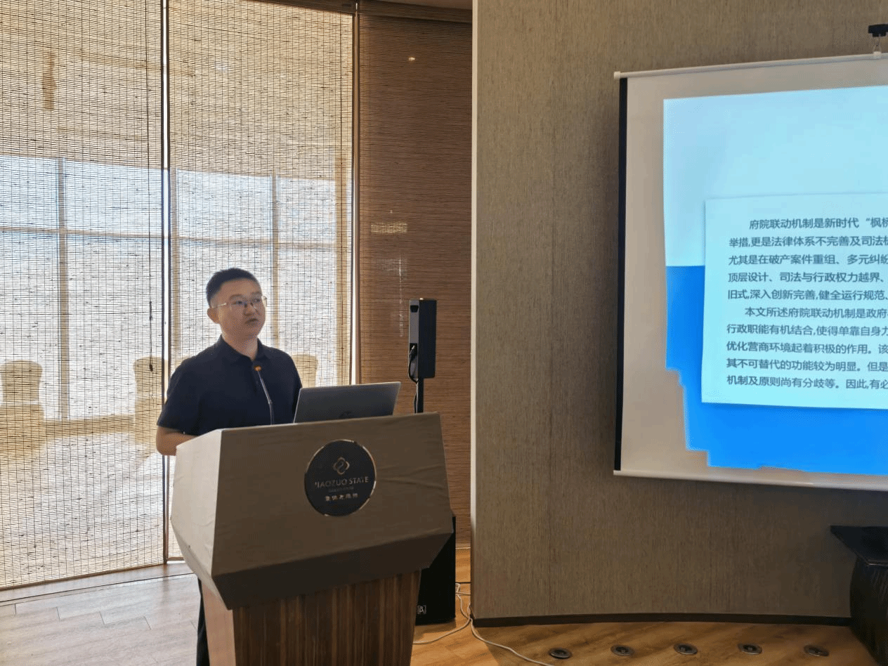 张海峰以《论府院联动机制促优营商环境困境破局与范式重构》为题进行发言。指出府院联动是新时代“枫桥经验”重要载体,在破产重整、多元解纷中成效显著,但存在顶层设计不足、权力边界模糊、融合不深等问题,提出应完善立法明确权责、规范运行程序,强化司法与行政互补,建立常态化工作机制,推动信息共享与奖惩并行,以焦作模式为借鉴,全面优化法治化营商环境。