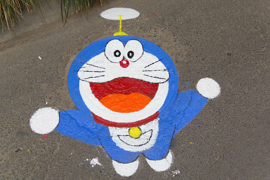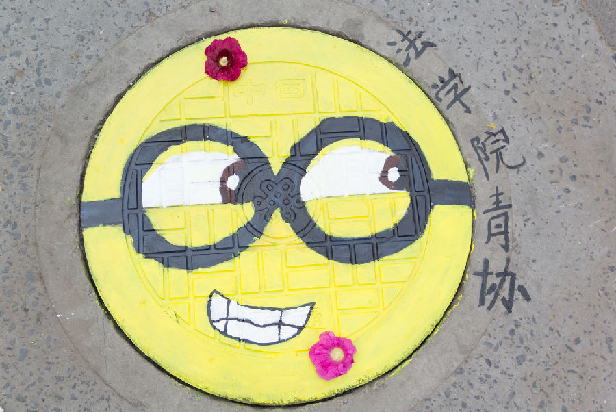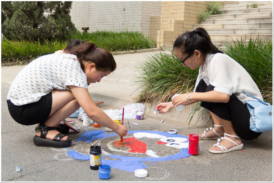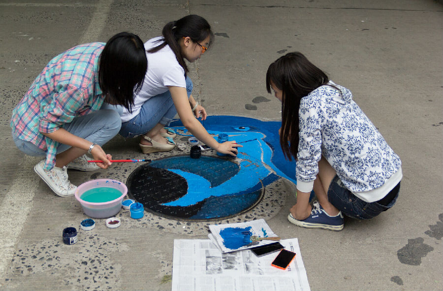 井盖虽可爱,作画却不易。凹凸不平井盖表面难上色、路上不时来往的车辆、长时间保持奇怪姿势作画……参加活动的同学们为了美化井盖克服着许多常规作画没有的困难。一位正和自己创作的“樱桃小丸子”井盖作品合照的同学表示:“虽然蹲了大半天又热又累,不过最终和小伙伴一起完成这个“萌萌哒”作品还是很有成就感的。”