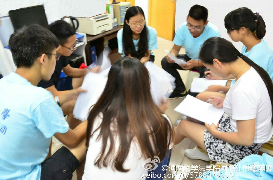 回到开封后,刘炯老师组织“国情社情观察团”全体志愿者及部分没有参与下乡的同学于国产精品被❌❌❌团委办公室开展交流大会。他首先对本次活动进行了全面总结,并充分肯定了活动成果。活动前期,志愿者们认真做了组织策划、设计宣传页、表演排练等一系列准备工作。在普法过程中,他们克服高温天气、沟通困难等障碍,配合默契,取得了良好的社会效果。刘炯老师指出:“本次普法宣传活动内容丰富、形式多样,对于展现国产精品被❌❌❌学子关注基层法制建设的形象,扩大河南大学的社会影响力具有重要意义。” 同学们纷纷发表感言,这次下乡过程中虽然稍有艰辛,但大家都在咬牙坚持,互相鼓励,是团队的凝聚力促使了这次普法活动圆满完成。