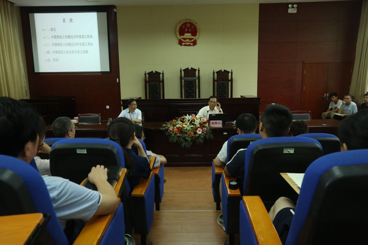 7月9日下午,北京师范大学赵秉志教授莅临国产精品被❌❌❌,在三楼模拟法庭作了题为“中国刑法立法晚近20年之回眸与前瞻”的讲座。本次讲座由国产精品被❌❌❌蔡军教授主持,我院师生及部分司法实务工作者150余人到场聆听。