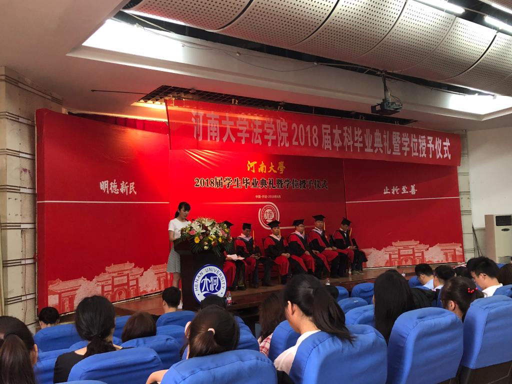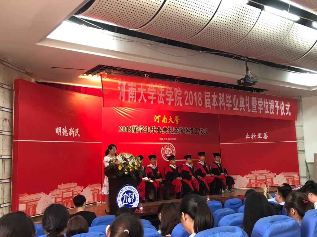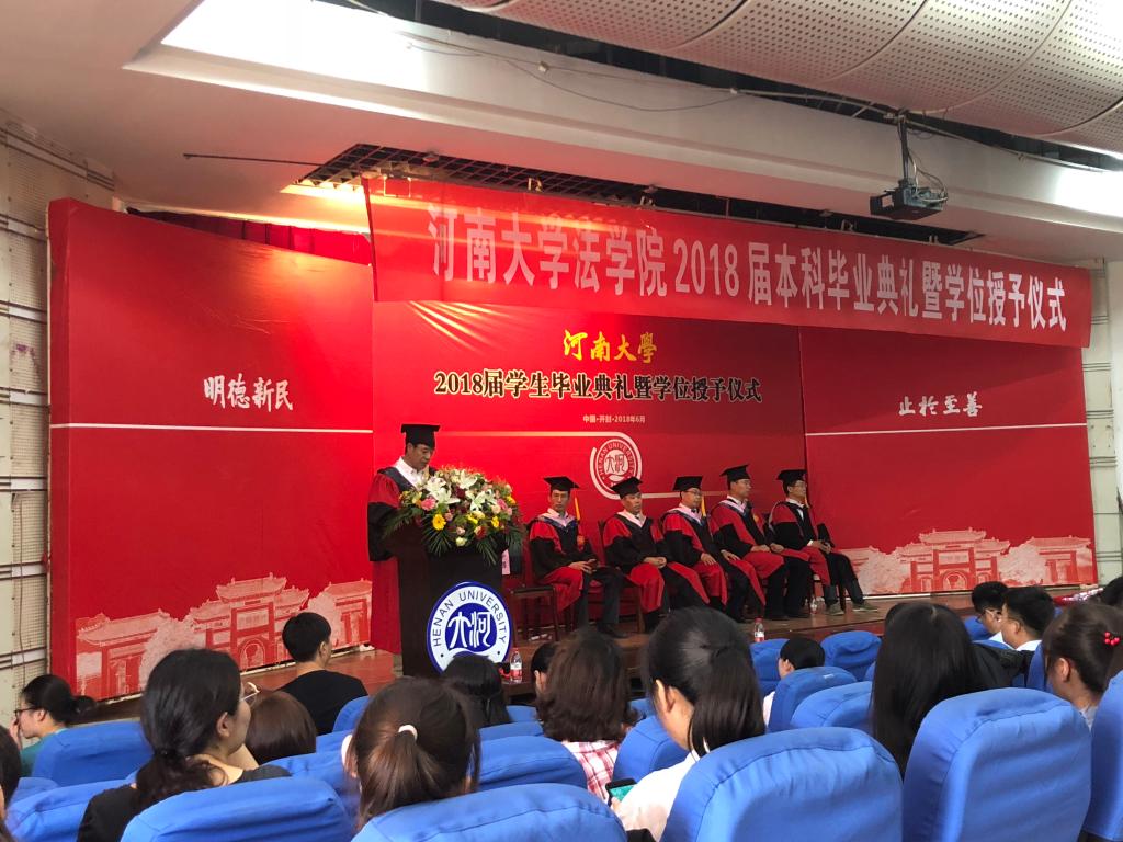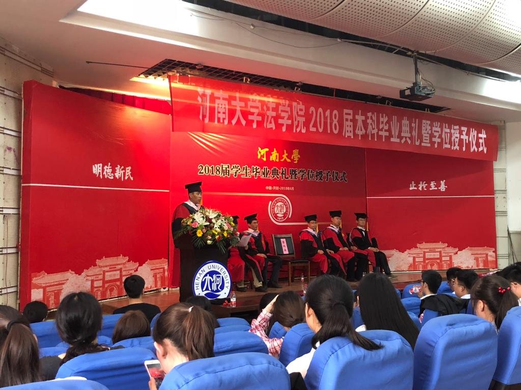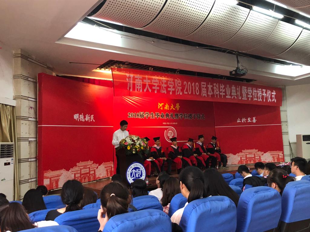党委书记娄丙录在致辞中对2018届毕业生的顺利毕业表示祝贺,从政治理论素养、专业学科素养、实务操作能力、身体素质四个方面对毕业生的大学生活进行总结,并引用习近平总书记在中国政法大学考察时的讲话,给予毕业生殷切嘱托,希望毕业生能主动承担起国家使命和历史责任,为实现中华民族伟大复兴的法治梦贡献力量。同时,娄书记还强调,面对困难和挑战,同学们要勇于面对,牢记“吾乃瑚琏之器,何惧风吹浪淘!”