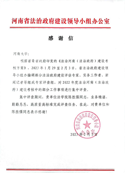 河南省法治政府建设领导小组办公室来函感谢陈胜强副教授参与法治河南(法治政府)建设考核集中评查工作