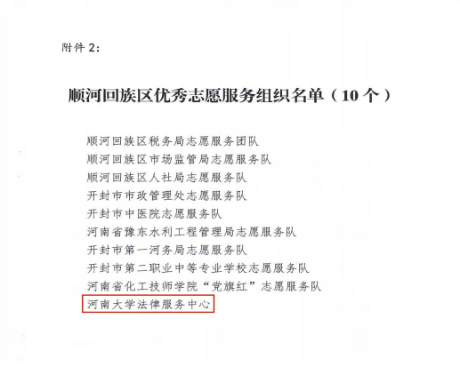 河南大学法律服务中心荣获顺河区“优秀志愿服务组织”称号!
