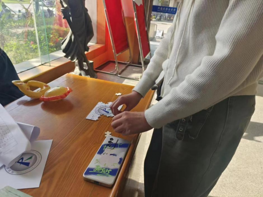 3.知识产权拼图。同学们在规定时间内将35片知识产权标识拼图成功拼成一张完整的图,即可获得小奖品。轻松愉悦的游戏方式加深了同学们对知识产权图标的认识。