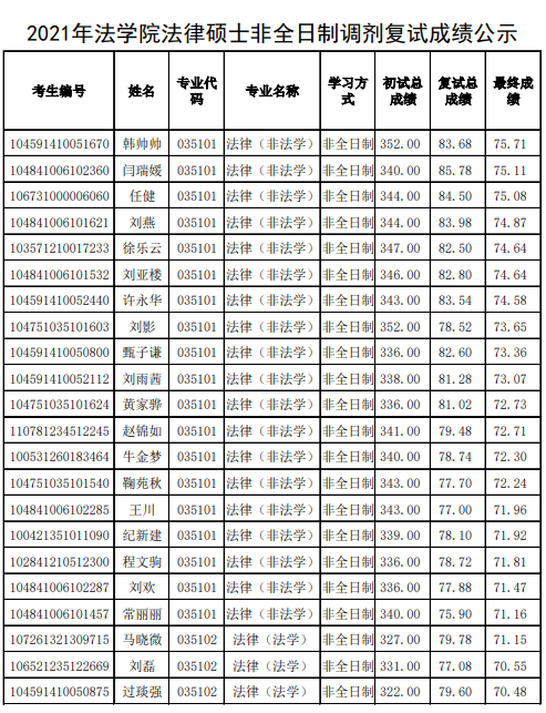 按学校要求,现将我院2021年法律硕士非全日制调剂复试成绩公示如下: