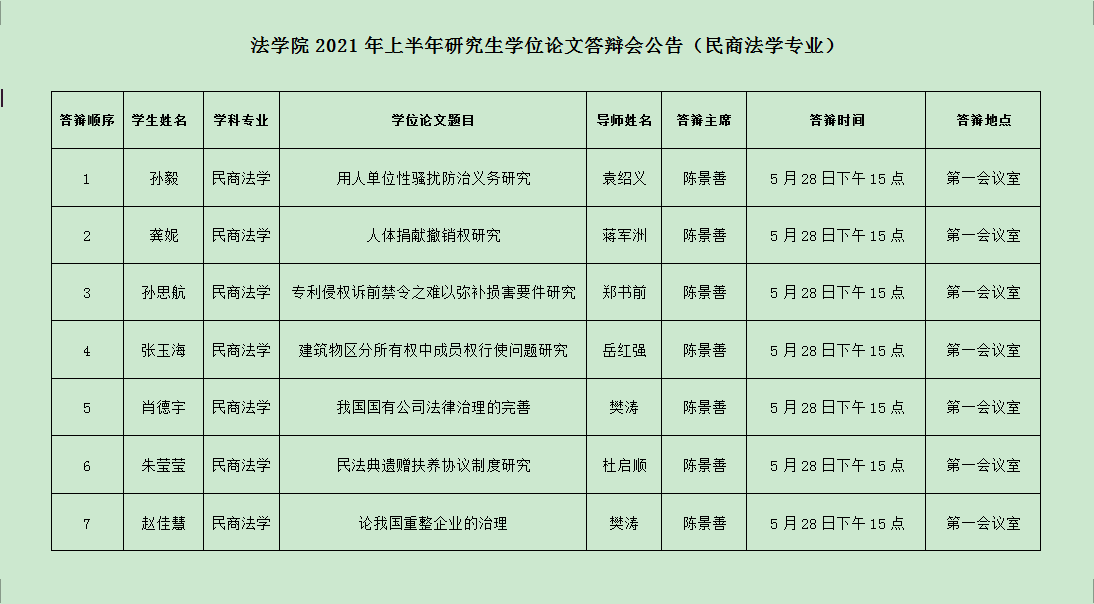 国产精品被❌❌❌2021年上半年研究生学位论文答辩会公告(民商法学专业)