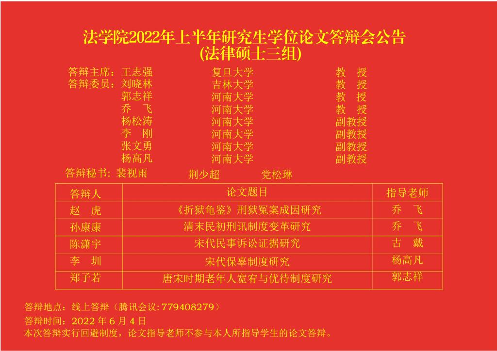 国产精品被❌❌❌2022年上半年研究生学位论文答辩会公告(法律硕士三组)