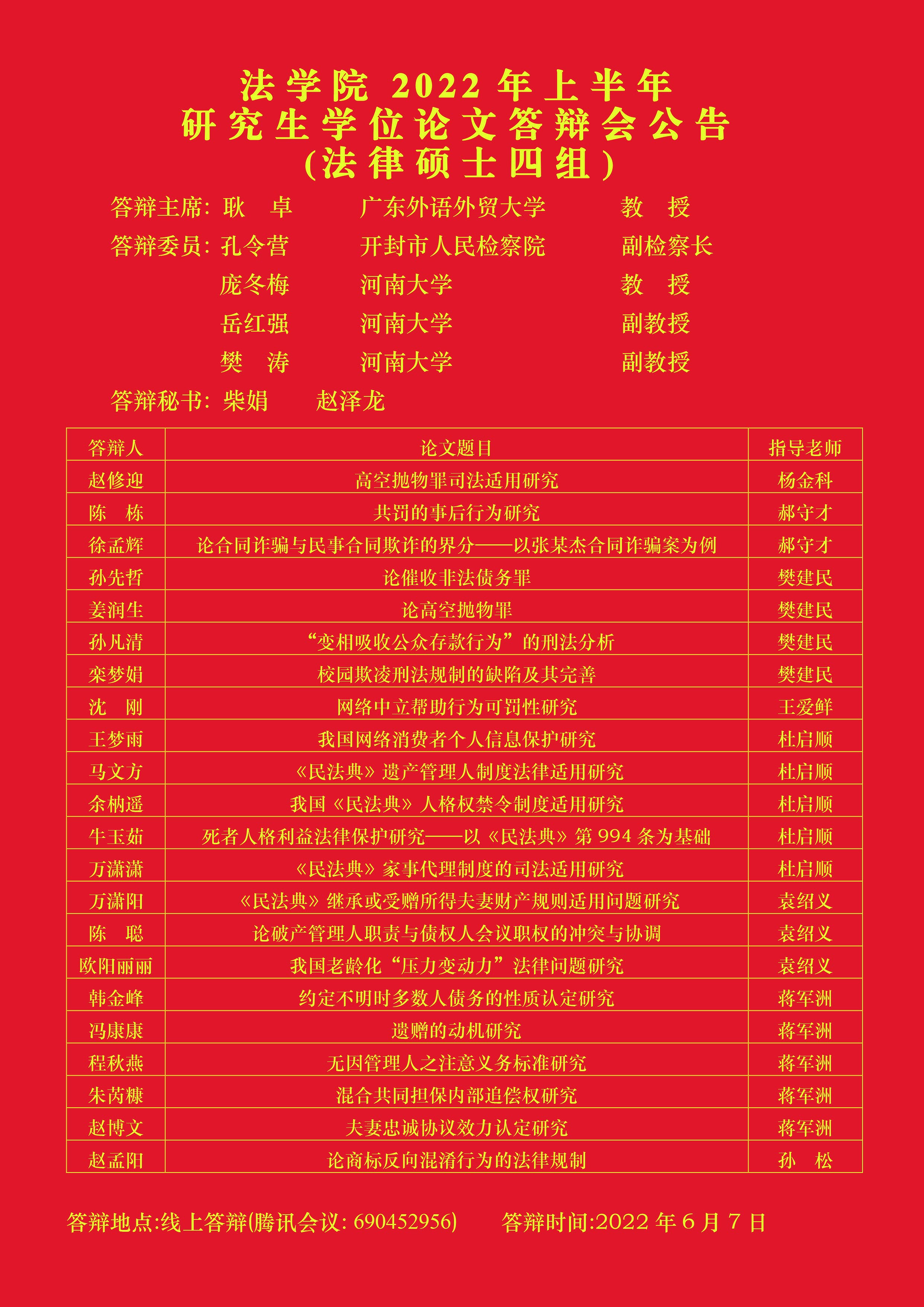 国产精品被❌❌❌2022年上半年研究生学位论文答辩会公告(法律硕士四组)