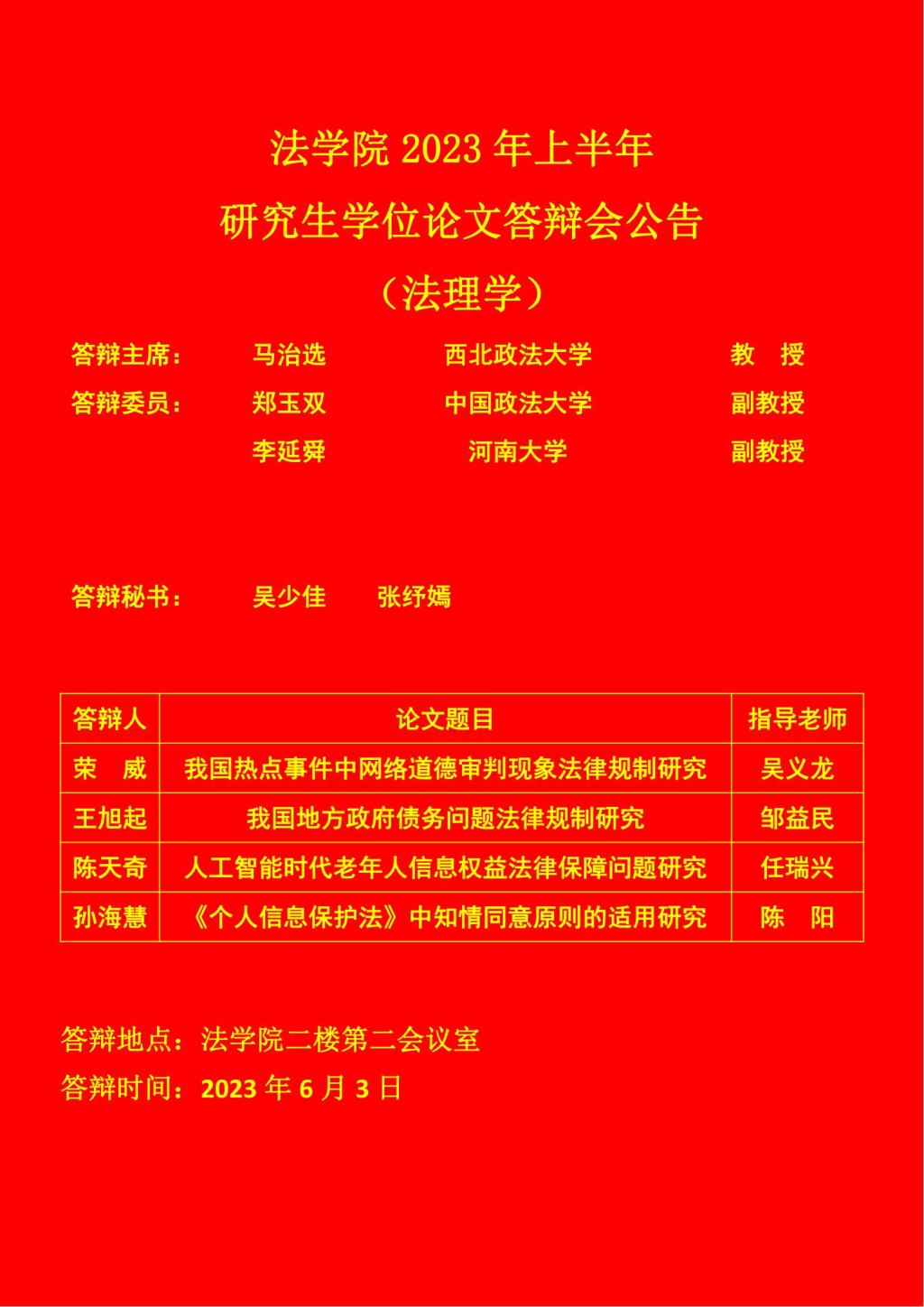 国产精品被❌❌❌2023年上半年研究生学位论文答辩会公告(法理学)