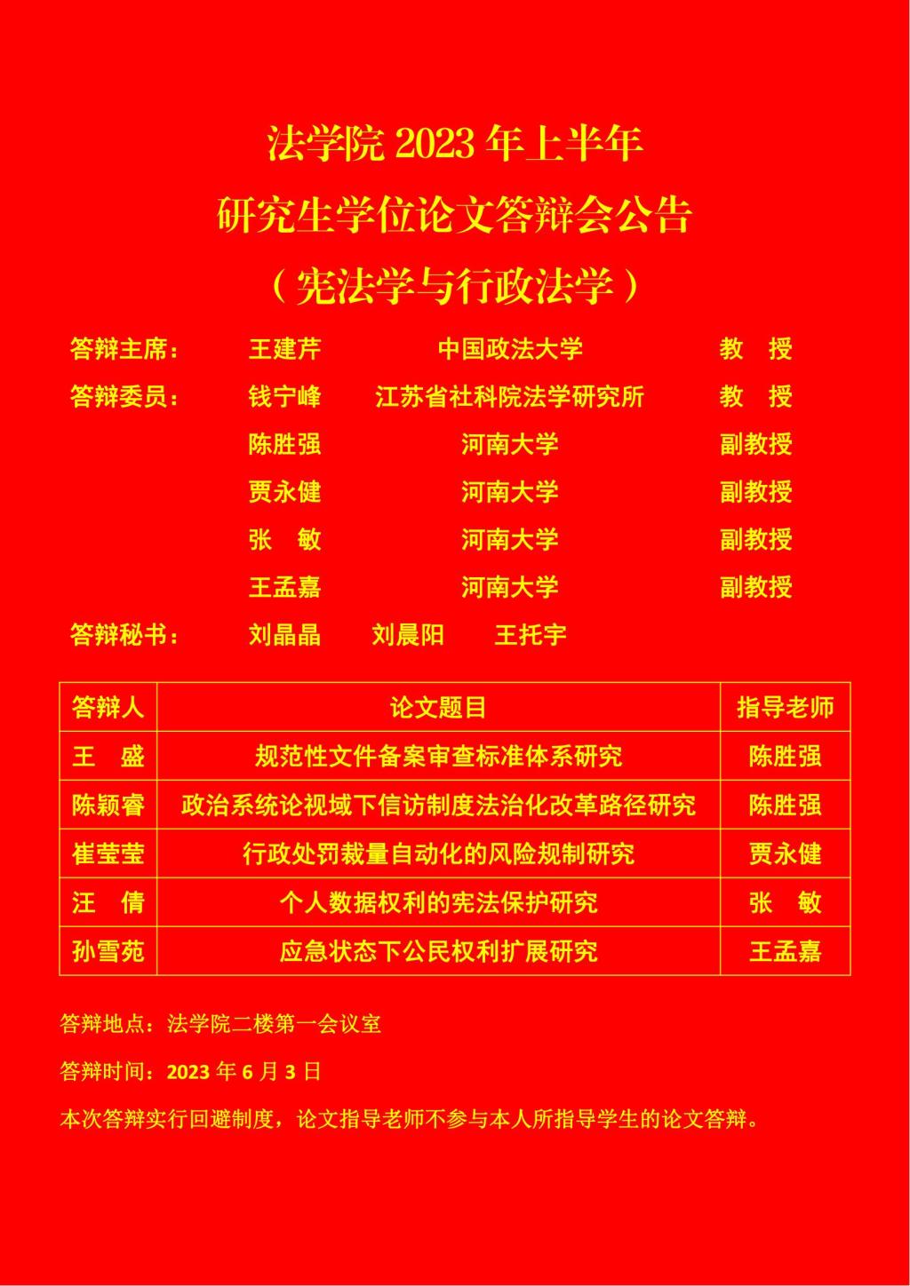 国产精品被❌❌❌2023年上半年研究生学位论文答辩会公告(宪法学与行政法学)