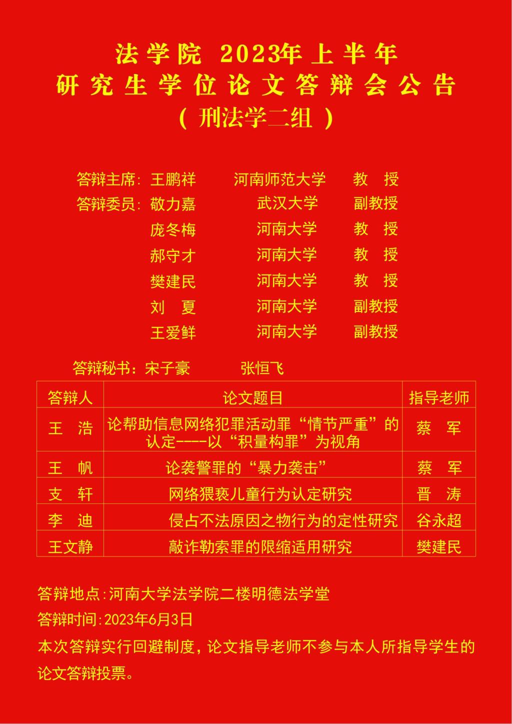 国产精品被❌❌❌2023年上半年研究生学位论文答辩会公告(刑法学二组)