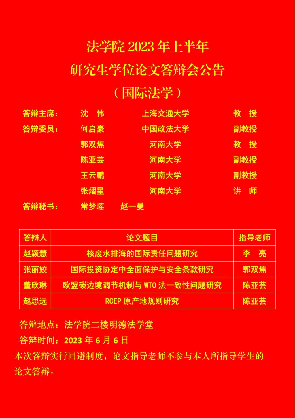国产精品被❌❌❌2023年上半年研究生学位论文答辩会公告(国际法学)