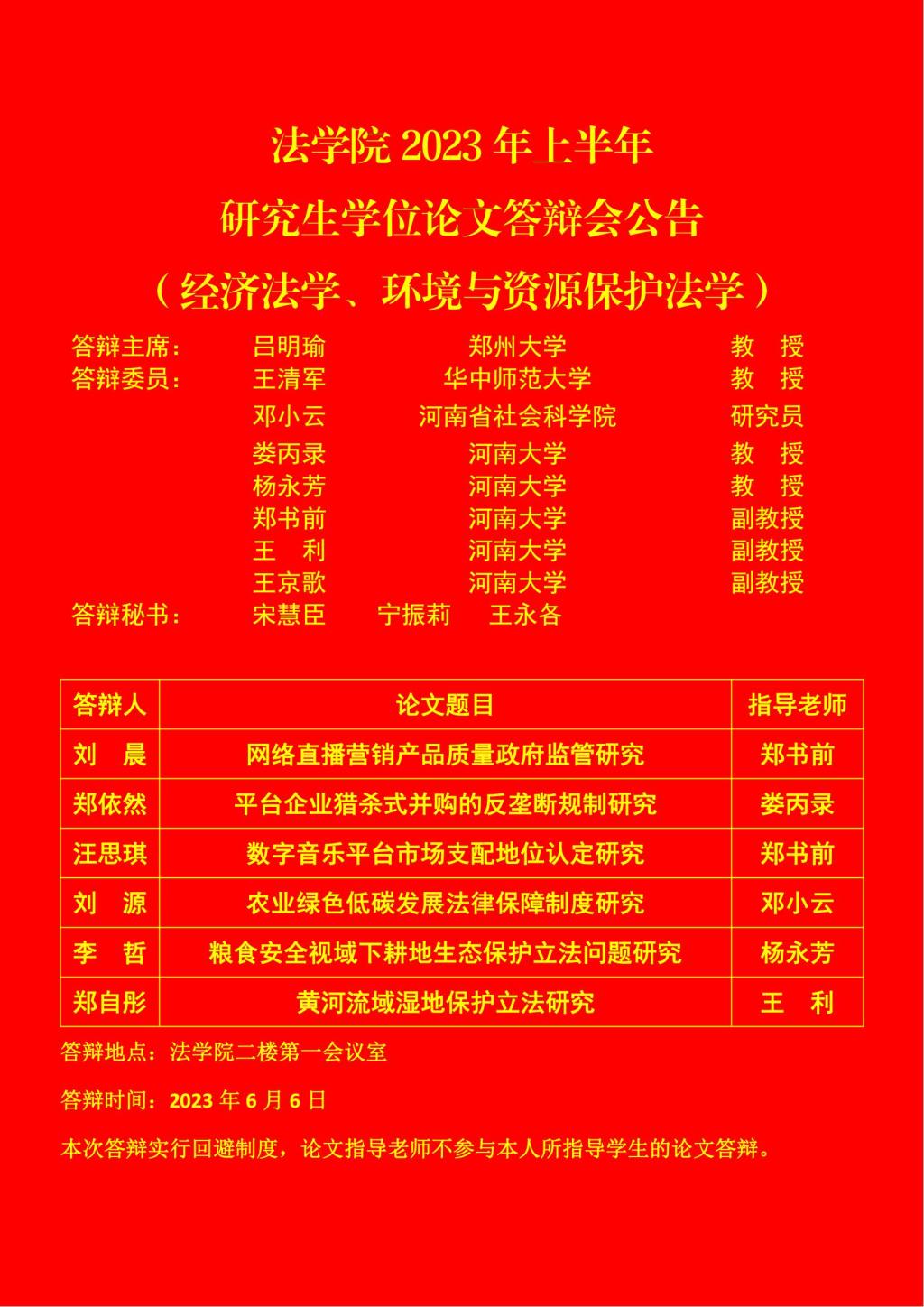 国产精品被❌❌❌2023年上半年研究生学位论文答辩会公告(经济法学、环境与资源保护法学)