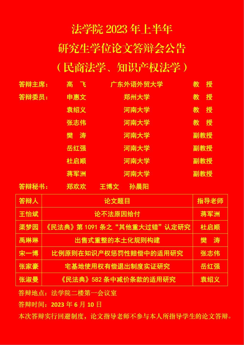 国产精品被❌❌❌2023年上半年研究生学位论文答辩会公告(民商法学、知识产权法学)