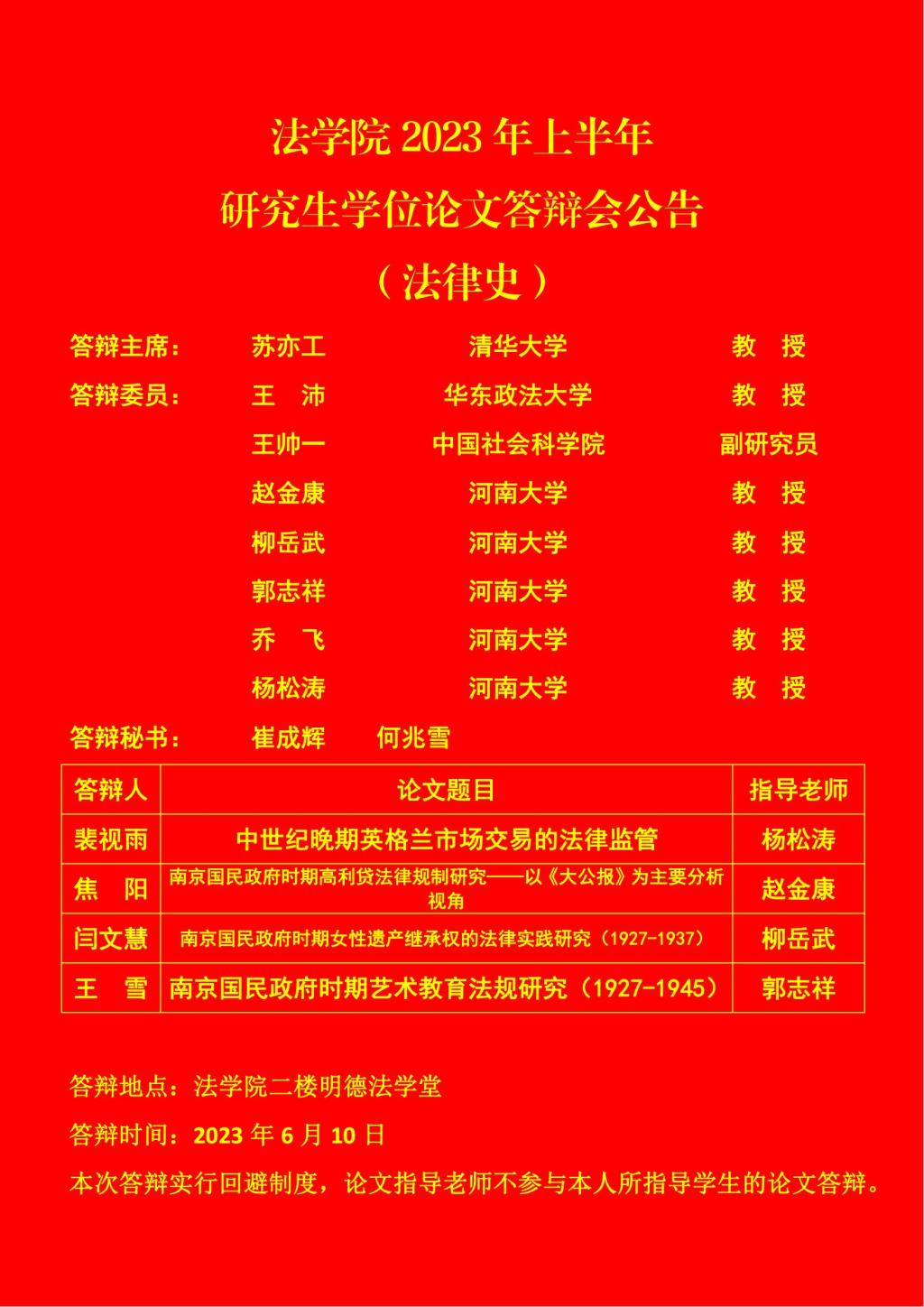 国产精品被❌❌❌2023年上半年研究生学位论文答辩会公告(法律史)