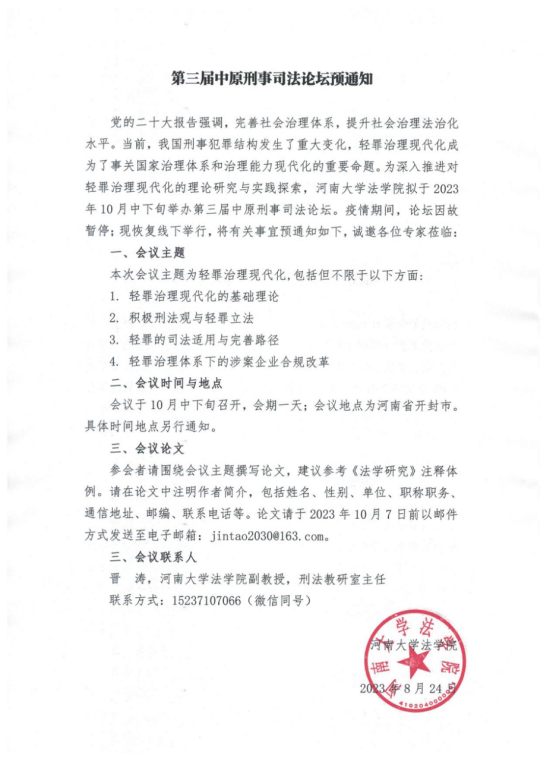 党的二十大报告强调,完善社会治理体系,提升社会治理法治化水平。当前,我国刑事犯罪结构发生了重大变化,轻罪治理现代化成为了事关国家治理体系和治理能力现代化的重要命题。为深入推进对轻罪治理现代化的理论研究与实践探索,河南大学国产精品被❌❌❌拟于2023年10月中下旬举办第三届中原刑事司法论坛。疫情期间,论坛因故暂停;现恢复线下举行,将有关事宜预通知如下,诚邀各位专家莅临: