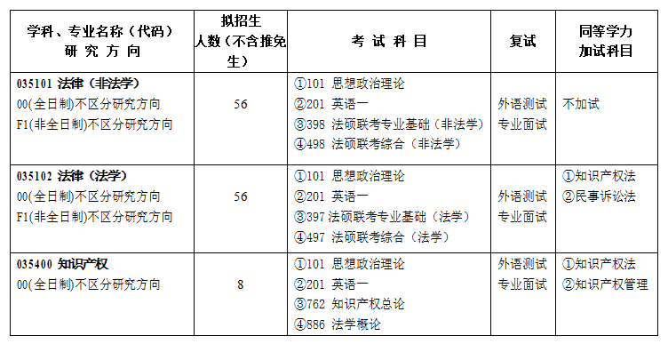 专业学位 | 法律(法学) | 035102 | 政治≥47 英语≥47 | 专业课1≥71 专业课2≥71 | ≥337 |