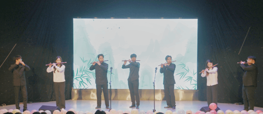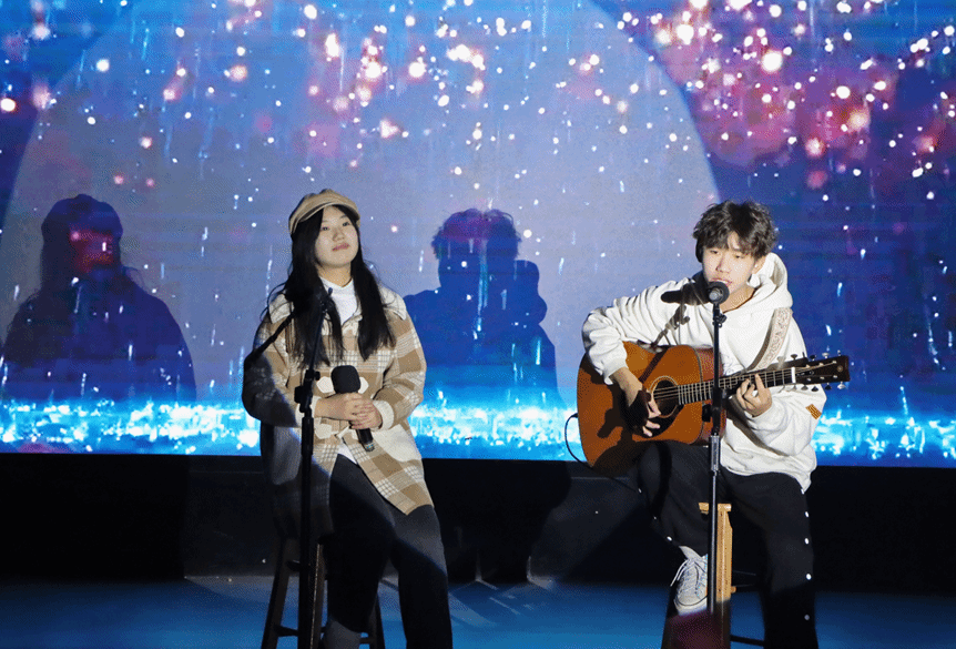 看!《告白气球》甜蜜的旋律让人感受到青春爱恋的悸动;竹笛一曲余音绕梁,仿佛能引天地共鸣,同学们好似随着笛音《走进快活林》;动听的歌声伴着吉他的拨弹,《雨爱》不禁回忆夏日雨晰晰,屋檐下萌动春心。