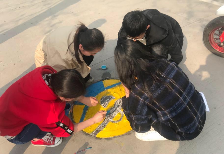 在活动准备前期,来自不同院系的同学们踊跃报名,积极发表意见,提交大量的创意彩绘作品供选择。活动期间,同学们或蹲着或坐在地上,围绕着小小的井盖开始了自己的创意之旅。他们分工明确,密切合作,共同努力着。一个个彩绘作品在心灵手巧的同学们手中渐渐成型,已完成的彩绘作品引来周围人群的肯定与赞叹。