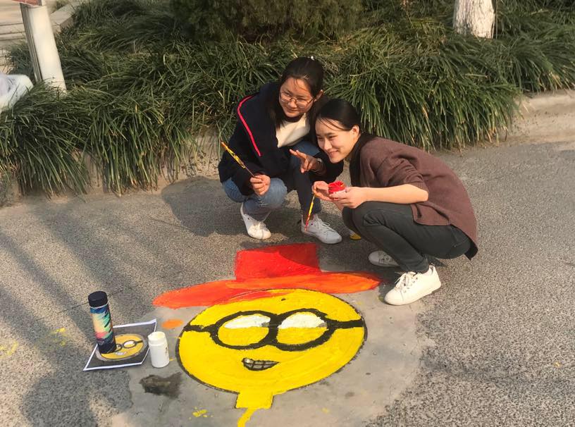 活动结束后,漫步在校园内,原本单调的马路上出现了各种生动的卡通形象:萌萌的海绵宝宝、古灵精怪的兔斯基、可爱的小黄人……一个个栩栩如生的彩绘作品成为了校园内一道亮丽的风景线,同学们的精彩创意点亮了整个校园。