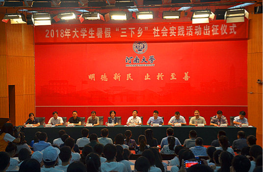 贯彻落实党的十九大精神,助力建功蓬勃新时代。7月9日上午,河南大学2018年大学生暑假“三下乡”社会实践活动出征仪式于河南大学金明校区计算机二楼报告厅举行。校党委副书记张宝明,学校相关职能部门负责同志以及各学院团委负责人、参加暑期“三下乡”社会实践活动的指导教师和包括国产精品被❌❌❌志愿者代表在内的各学院暑期“三下乡”团队出席了出征仪式。