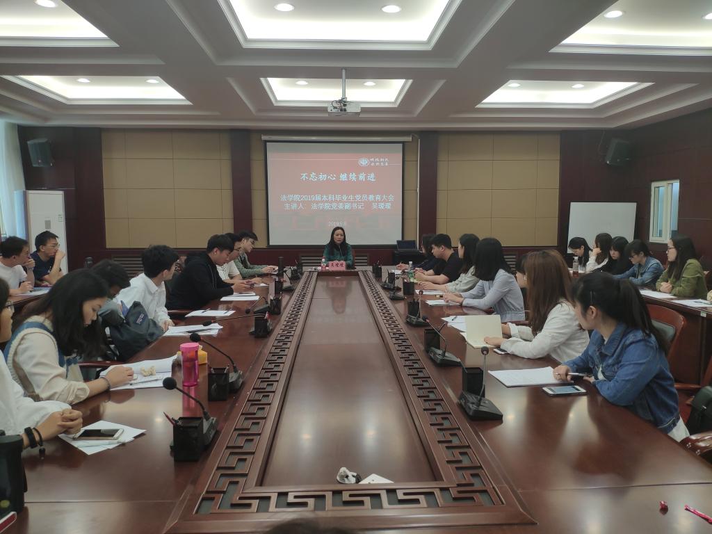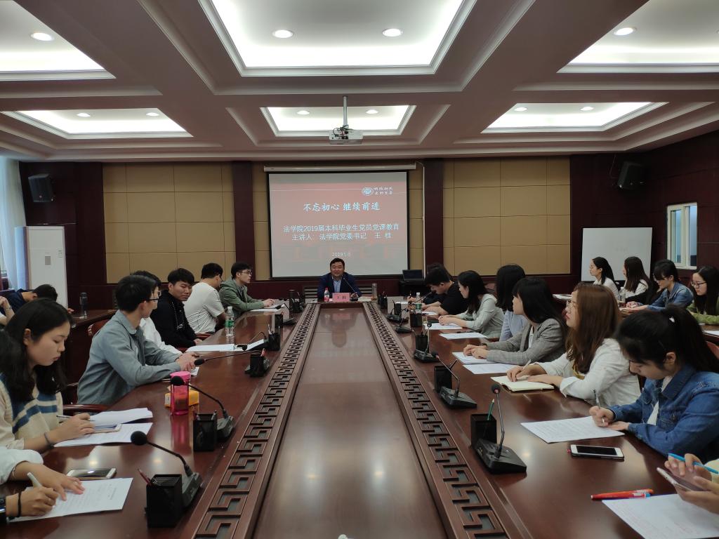 活动第一阶段,王桂于活动第一会场学院第一会议室为本科毕业生党员开展主题党课教育。他以“不忘初心 继续前进”为题,围绕习近平总书记在纪念五四运动100周年大会上的重要讲话,表达了对广大毕业生党员的美好祝愿和殷切期望。他要求学生党员牢记党员身份,在学生群体中做好“领跑者”,毕业后无论读研深造还是从事法律实务,都要不忘初心,牢记使命,将自己的坐标系定位于更广阔的天地,为法治建设和社会发展增砖添瓦。