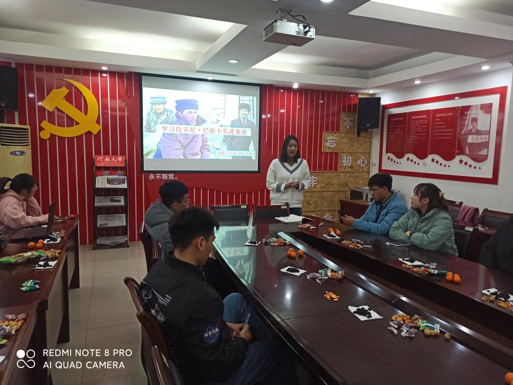 在共进班的学习中,土家族学生胡智飞为大家介绍了拉齐尼·巴依卡同志一家三代为国尽忠的英勇事迹,带领大家回顾了拉齐尼为边疆安全做出的杰出贡献。通过影视记录,同学们回顾拉齐尼英勇解救落水儿童的危情一小时,见证了“时代楷模”大爱无言、奉献无悔的伟大精神。