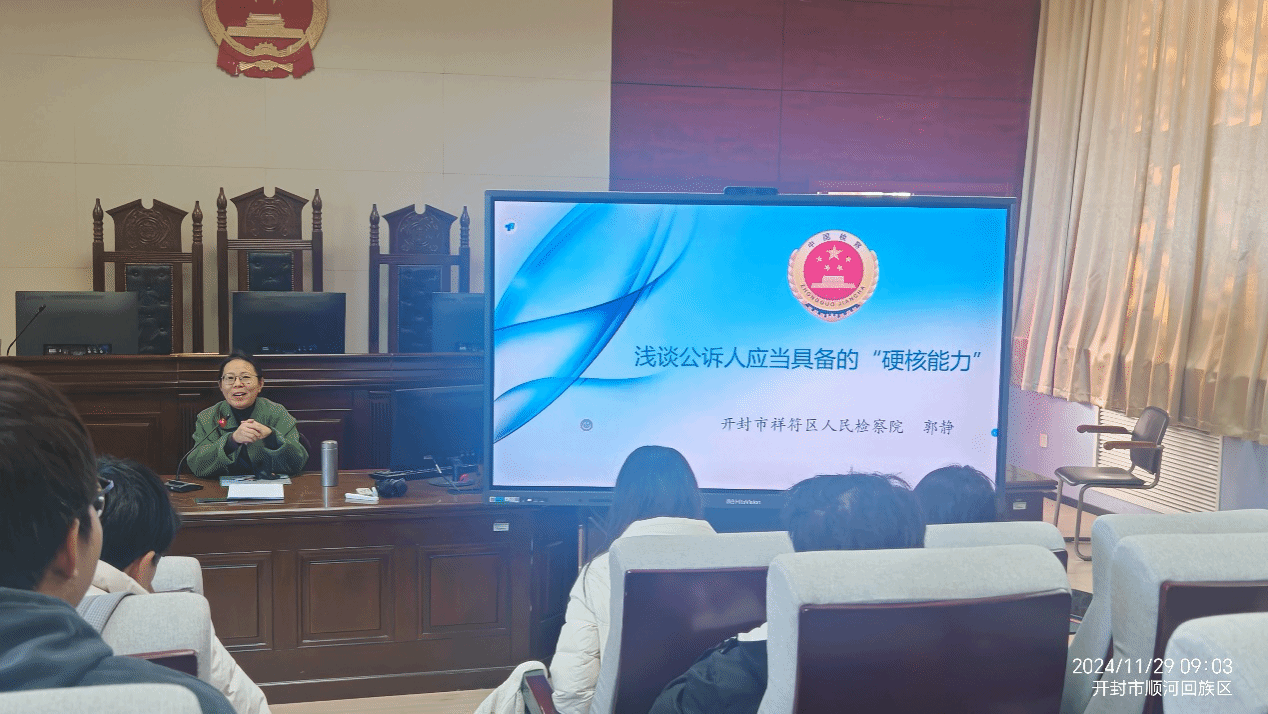 11月29日,开封市祥符区人民检察院专职检委会委员、第五检察部主任、一级检察官郭静,以“浅谈公诉人应当具备的硬核能力”为主题,讲解了如何在实际工作中充分运用分析判断能力、逻辑思维能力、法律适用能力、语言表达能力、法律监督能力以及升华案件能力。郭静指出,公诉人应具备耐心、细心和好奇心。在法庭辩论时,公诉人要灵活运用即兴表达技巧、说理论证技巧以及临场应变技巧。此外,郭静还针对出庭工作中存在的主要问题,如调查程式化、辩论空泛化等进行了深入剖析,并提出了相应的建议。