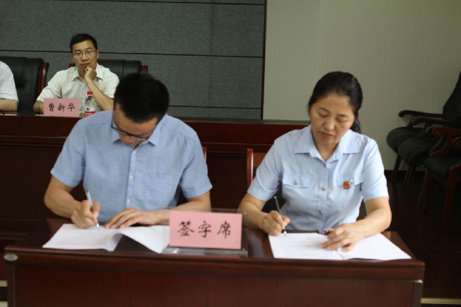 图为吴泽勇院长与开封市龙亭区人民法院董风艳院长在合作协议上签字