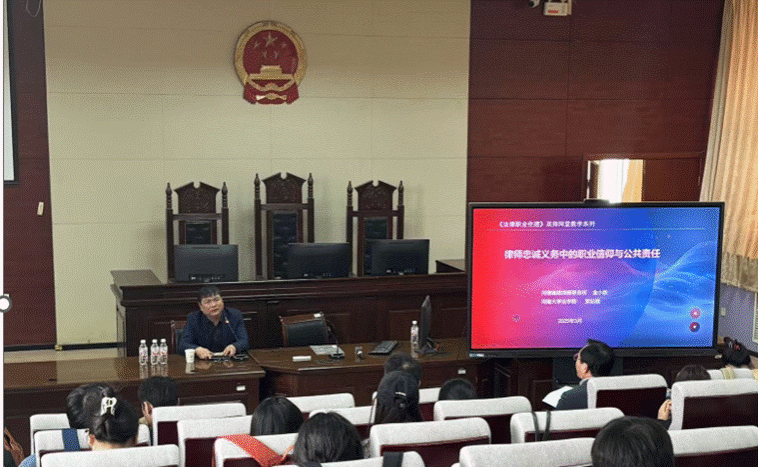 3月25日上午,我院研究生《法律职业伦理》双师同堂教学系列第一讲在模拟法庭举行。课程邀请实务专家河南城梁律师事务所主任金小新律师,围绕“律师忠诚义务的职业信仰与公共责任”这一主题作精彩演讲。国产精品被❌❌❌2023级、2024级法律硕士参加课程。