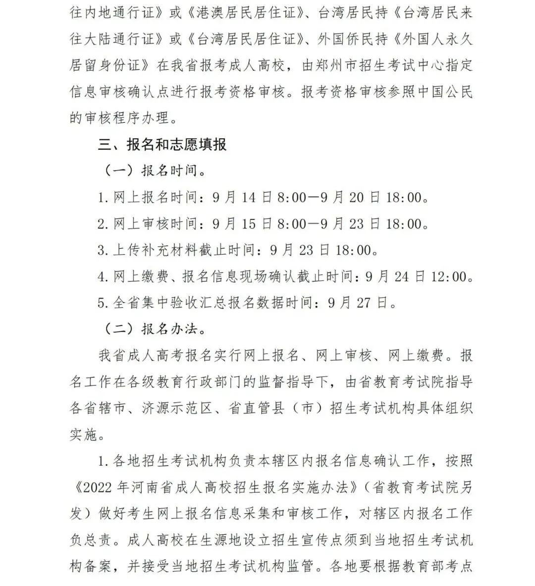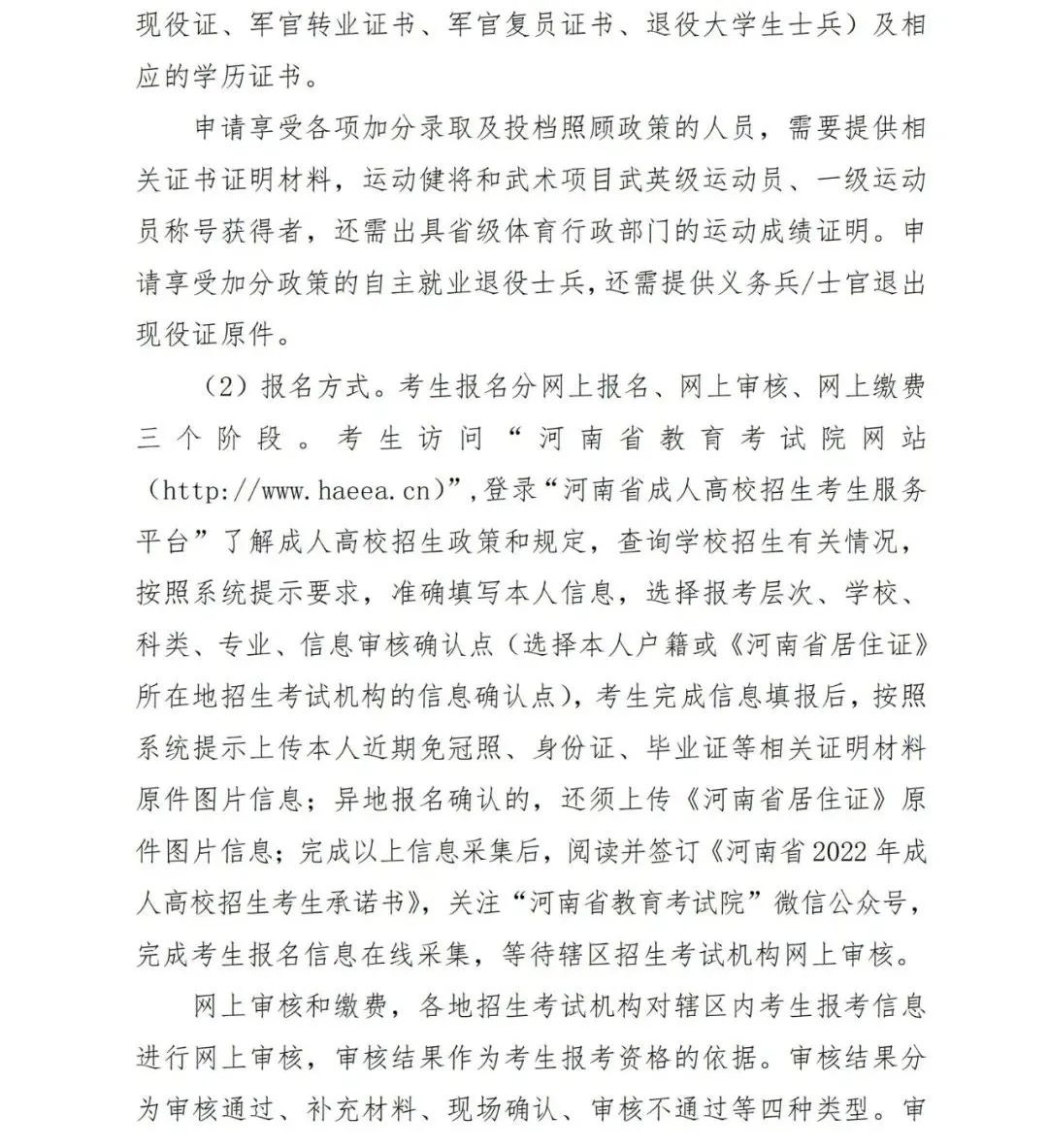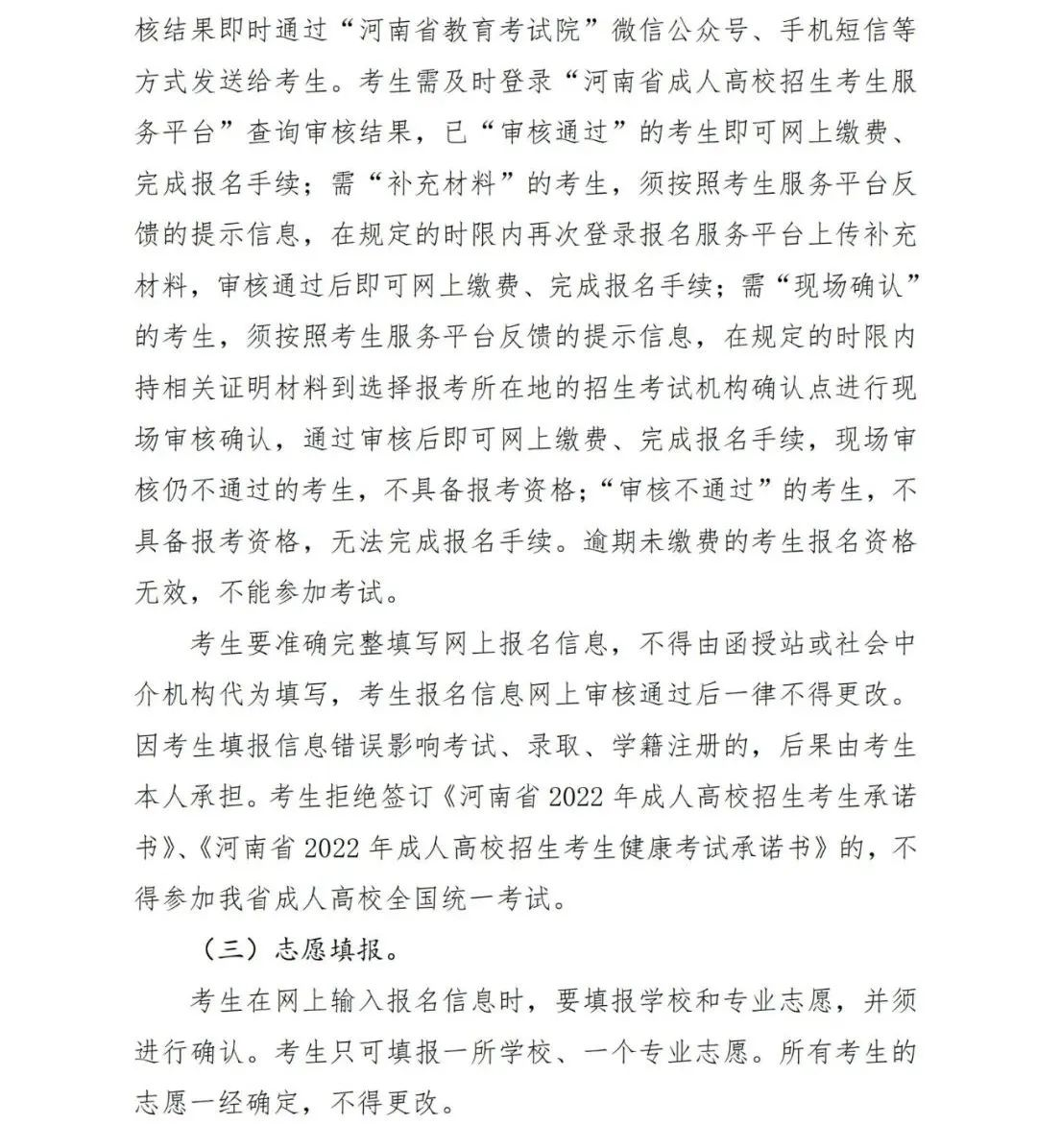 7.严密报名组织实施。各地教育行政部门和招生考试机构要做好考生网上报名的组织实施工作。招生考试机构要加强网上报名、志愿填报、信息采集、资格审核、缴费、绑定微信公众号和自行打印准考证的业务指导,做好工作人员培训和考生咨询服务,指导考生按要求阅读并签订《河南省2022年成人高校招生考生承诺书》和《河南省2022年成人高校招生考生健康考试承诺书》。各地招生考试机构,对需要到现场进行报名资格审核确认的考生,要在当地防疫部门的指导下,落实疫情防控措施,确保防疫安全。