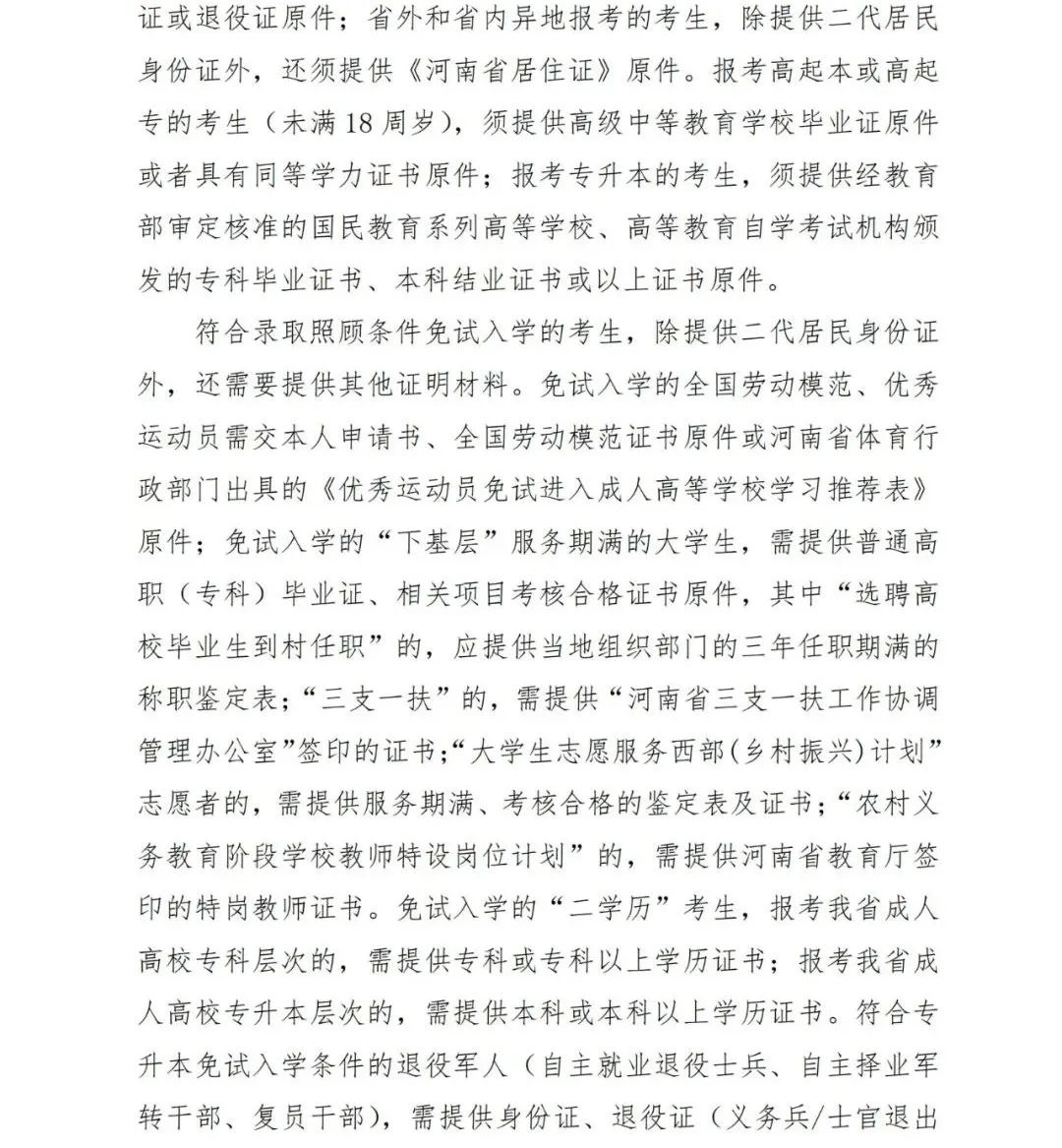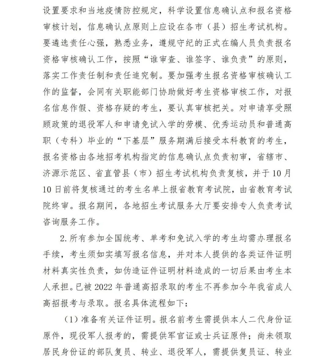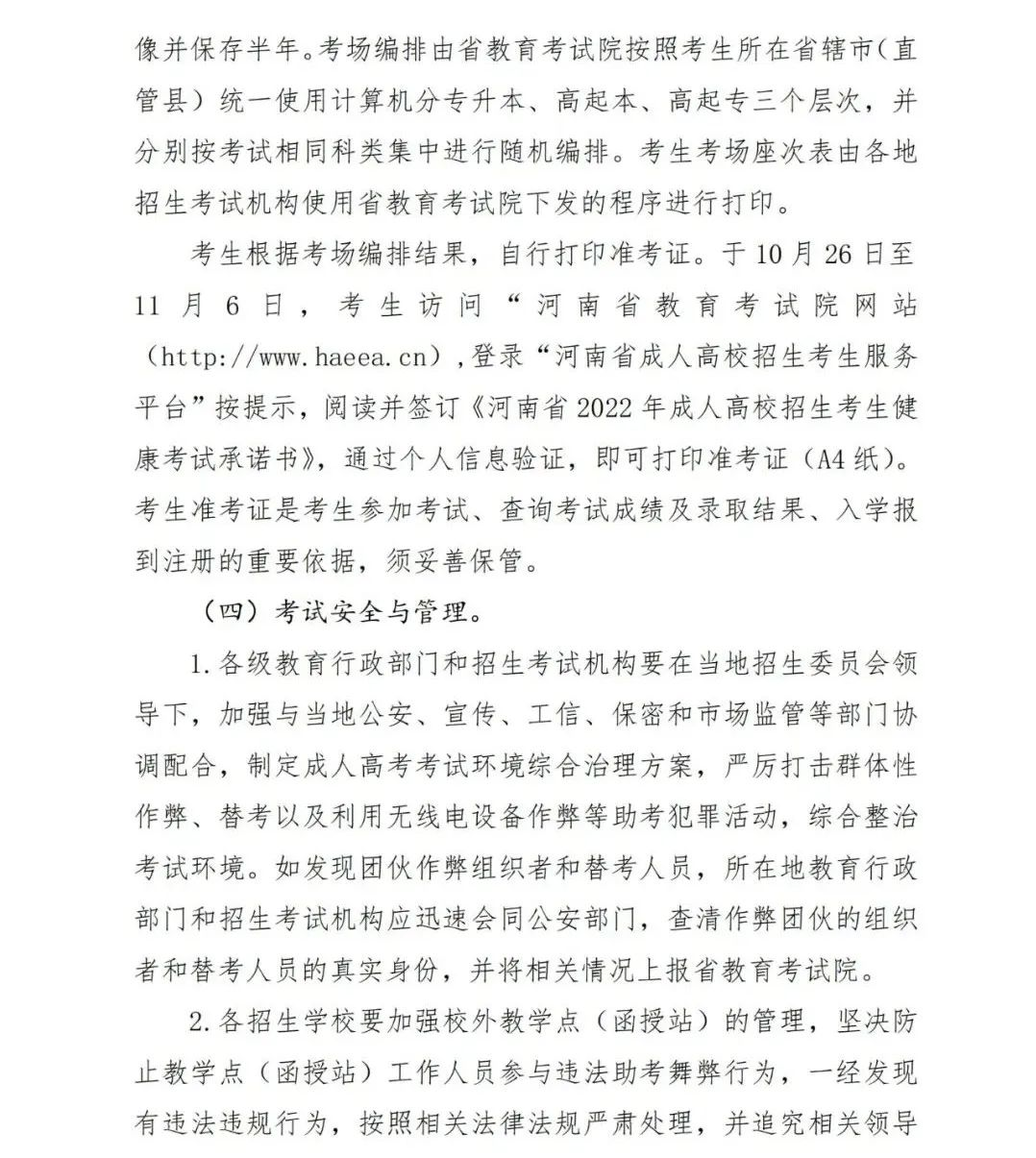 7.严密报名组织实施。各地教育行政部门和招生考试机构要做好考生网上报名的组织实施工作。招生考试机构要加强网上报名、志愿填报、信息采集、资格审核、缴费、绑定微信公众号和自行打印准考证的业务指导,做好工作人员培训和考生咨询服务,指导考生按要求阅读并签订《河南省2022年成人高校招生考生承诺书》和《河南省2022年成人高校招生考生健康考试承诺书》。各地招生考试机构,对需要到现场进行报名资格审核确认的考生,要在当地防疫部门的指导下,落实疫情防控措施,确保防疫安全。